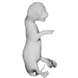 De voorpoten zijn al onderverdeeld zoals bij een volwassen kat met een inwendig skelet. De achterpoten zijn nog gewoon aanhangsels. Het oog vormt al pigment.