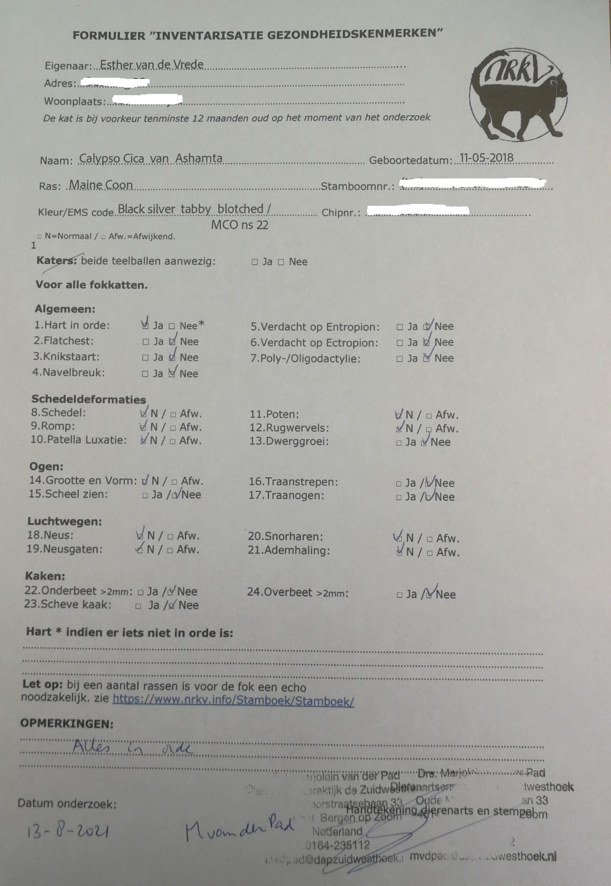 Omdat wij alleen met goed geteste dieren willen fokken hebben wij alvast zo'n formulier voor onze Cica in laten vullen.